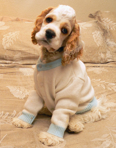 Dodger tries on a sweater, at 15 weeks of age
