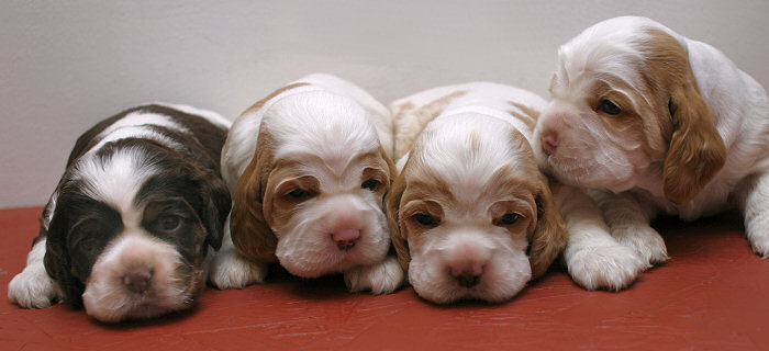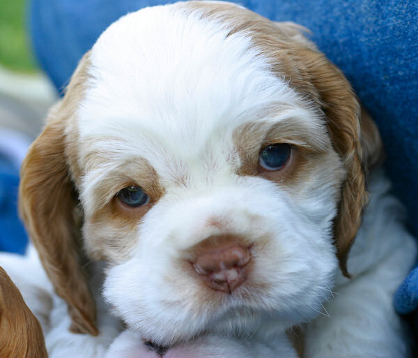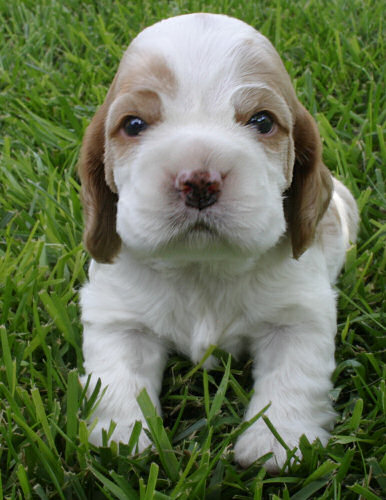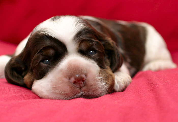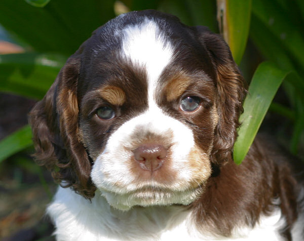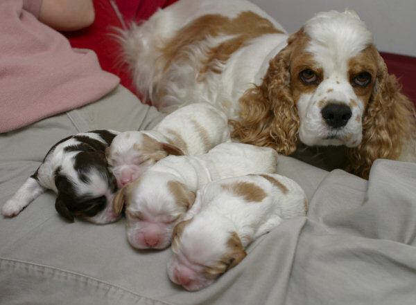Joanna is actually capable of making pups in three different colors: besides red & white and chocolate & white, she can also make black & white pups... although she didn't happen to have any in this particular litter. How do we know she can make black & white pups? Black is a dominant gene in Cocker coat coloring, and every parti colored Cocker is able to make black & white puppies. Whether they will or not depends on the genes of the dog you breed them to.