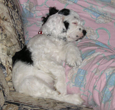 On the left, it's Chloe... daughter of our girl, Abby, and sister to our girl, Morgan. Chloe lives with Bob Aliamus in San Mateo... who reports that Chloe's favorite thing to do is to sit on his lap after dinner and take a nice nap while Bob watches TV.
