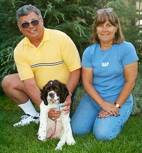 | "The Big Moose" Owners: John & Marsha Short -- Visalia, California The Big Moose keeps the Shorts very entertained... , one day he howled along with the National Anthem on TV. Since then, John has learned that all he has to do is howl, and The Big Moose will howl along! You can see them playing this game in the picture on the left. Another funny stunt is the way he barks at the vacuum cleaner. John and Marsha joked that they should have named him CUJO because when he was a puppy he sank his teeth in to everything in sight. Life got even more interesting for The Big Moose in 2003 because John and Marsha got a second Cocker puppy from us. The two hit it off pretty well from the start, too. |