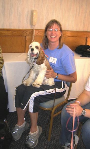 The Spyglass Inn has a great little conference room where we had a pizza party on Friday night. All the pizza you can eat, with Cockers at your feet! That's my idea of fun. It's the only indoor event of the weekend. In the photo above, you see Sharon Stevens, with her Zim dog, Peri, who came from our January 2006 litter.