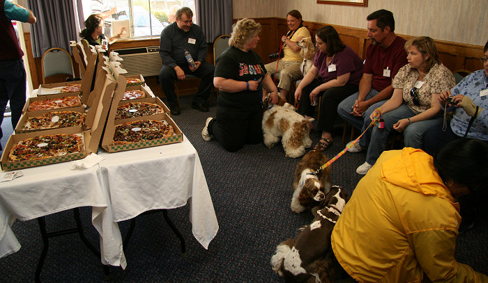 Try to get settled in by 6 PM, because that's when the first event of the weekend gets started: the pizza party! It's the only meal that we'll all have together during the weekend. We'll have a couple of tables with pizza and soft drinks set up right there by the doggie play area, and you can just put your dog inside the play area for a few minutes and enjoy your meal and the fellowship of all the other Cocker lovers. You might want to bring your own collapsible lawn chair or beach chair. I'll be paying for all the pizza up front... so just slip me a couple of bucks sometime during the evening to cover your share.