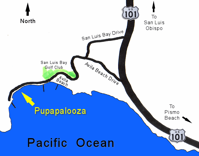 Take the Avila Beach Drive exit from the freeway. (If you are coming from the north, you can take a little shortcut and take San Luis Bay Drive which will then bring you to a stoplight at Avila Beach Drive, where you make a right turn.) Follow the signs to Port San Luis. When you see dozens of boats moored in the harbor, you're there. (Approximately four miles from the freeway.) Park your car somewhere in the vicinity of the 3 street lights or the pump shed. Look down on the beach, and you should see a bunch of Cocker Spaniels! Walk down the stairs and join the fun!