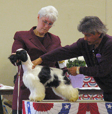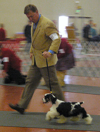 While we're on the subject of classy handlers, I've got to mention Bryon Santos who you see here helping to make this buff Cocker look his best. I've watched Bryon and his wife at several different shows now, and chatted with him a little on a couple of occasions, and I just have to say that these folks are impressive. If I ever decide to send one of my Cockers out on the show circuit, these are probably the first handlers I would call. They're very good at presenting the dogs, and you can tell that they really enjoy their work. Real pros!